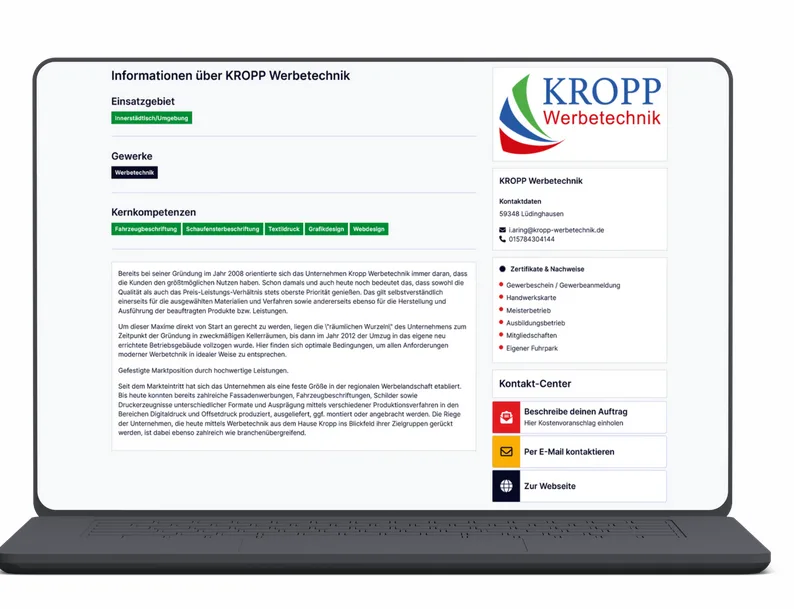 Die Profilseite bietet euch detaillierte Kontaktmöglichkeiten und einen Backlink zu eurer Website, um euer Unternehmen und eure Kernkompetenzen optimal zu präsentieren.